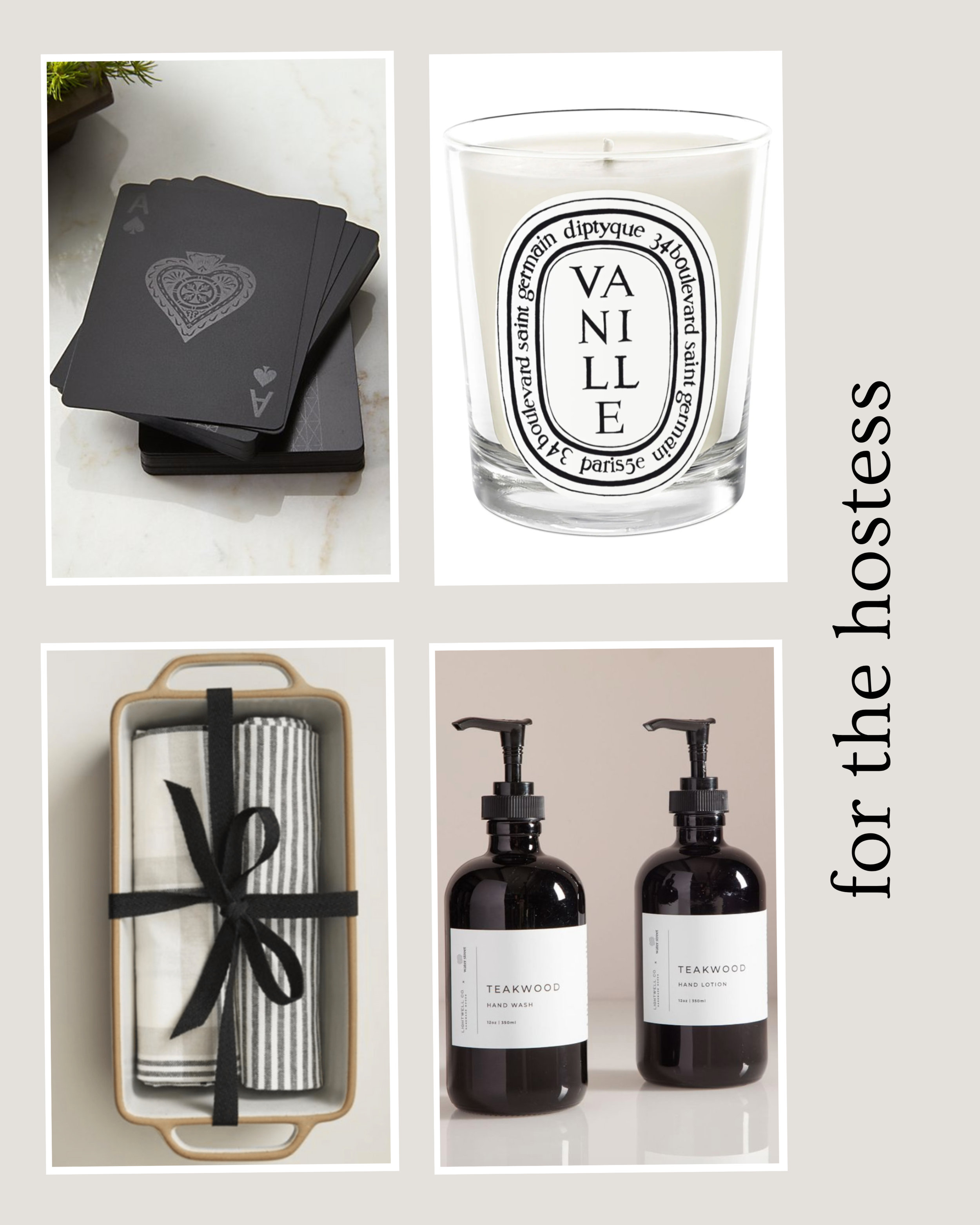 one: bougie and affordable playing cards / two: lusted candle of the world / three: perfect gift for the avid baker / four : who doesn’t need more hand soap and lotion?