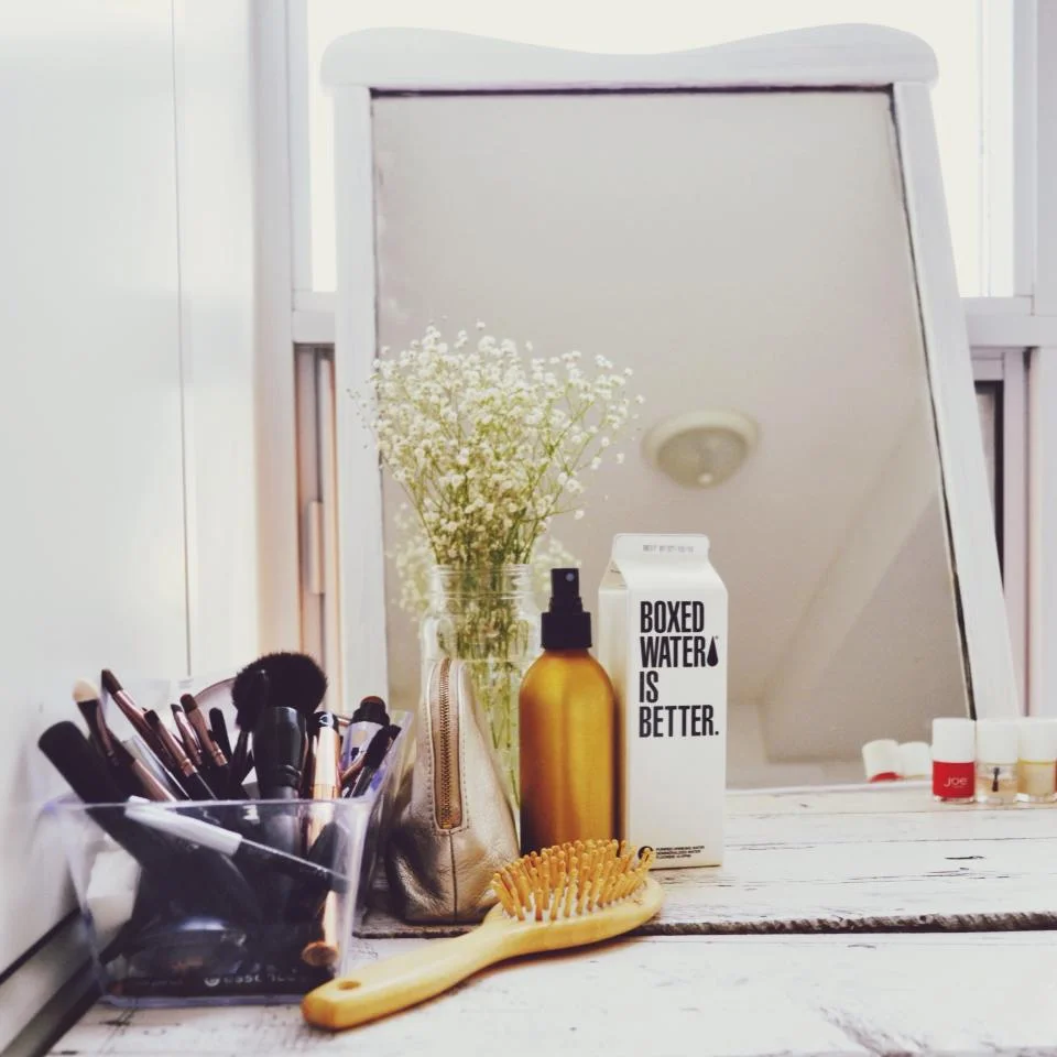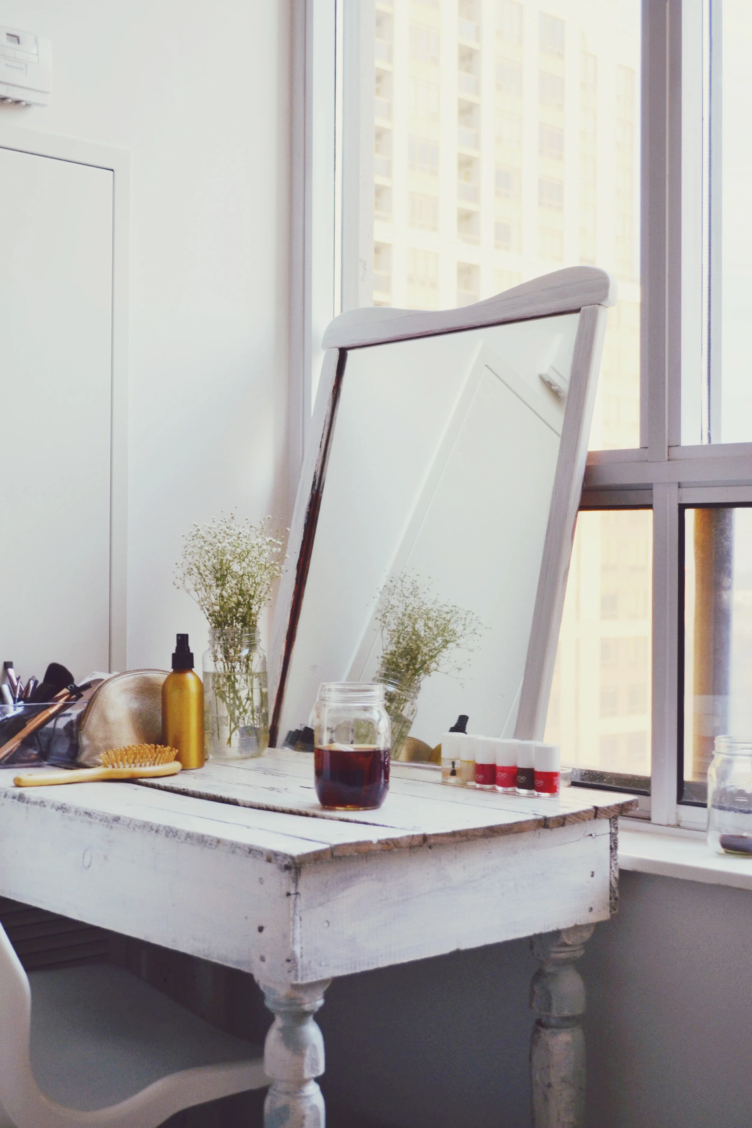 On my table I keep all my makeup & brushes in a clear case. I only have 8 nail polishes that I actually use so I store those on my table as well. In addition I always have fresh flowers; my go to being baby's breath because it's so fresh looking and lasts for a week no problem!