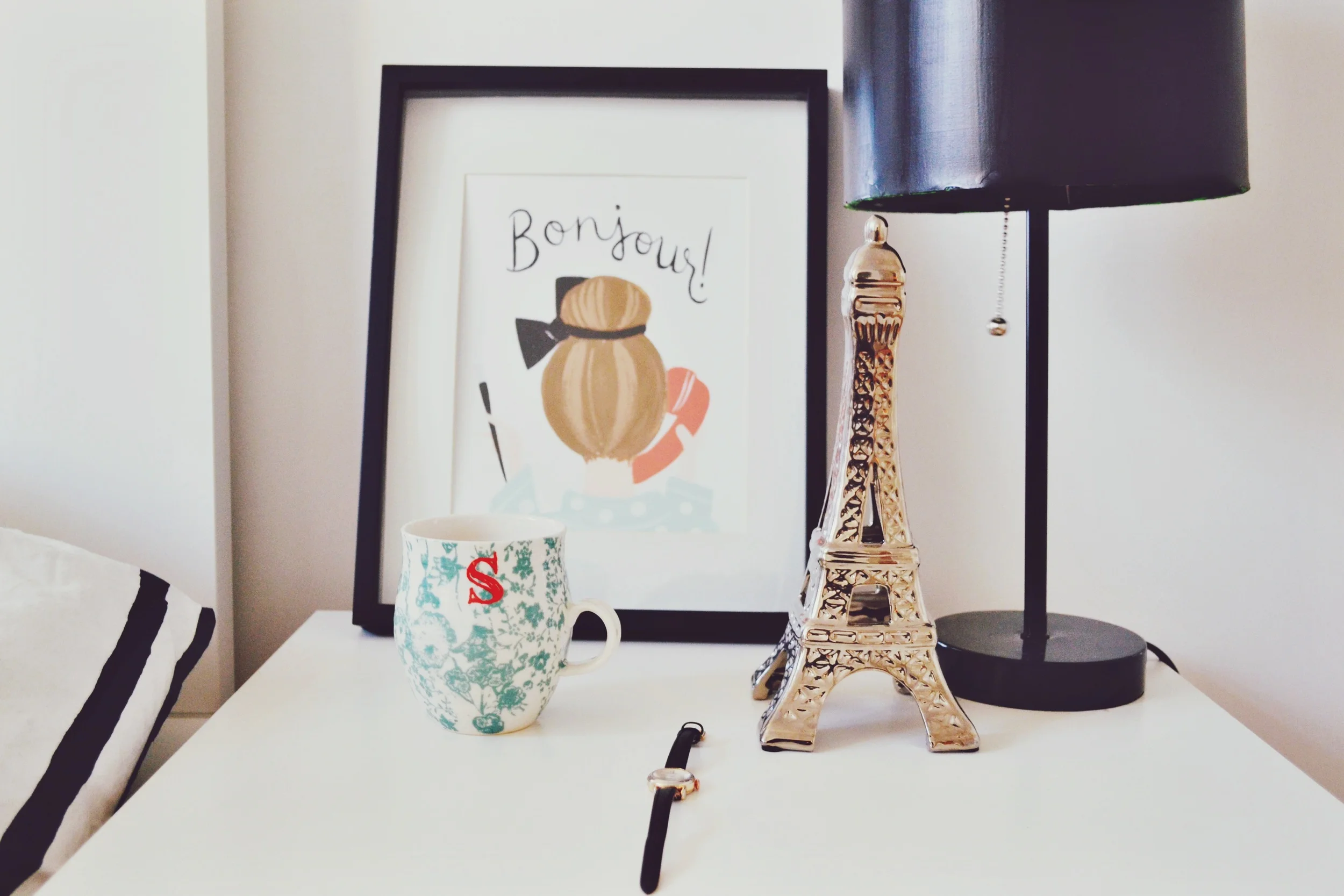Pictured above,"BONJOUR" Print, Homegrown Monogrammed Mug, Watch, Eiffel Tower , DIY painted Lamp, Similar.