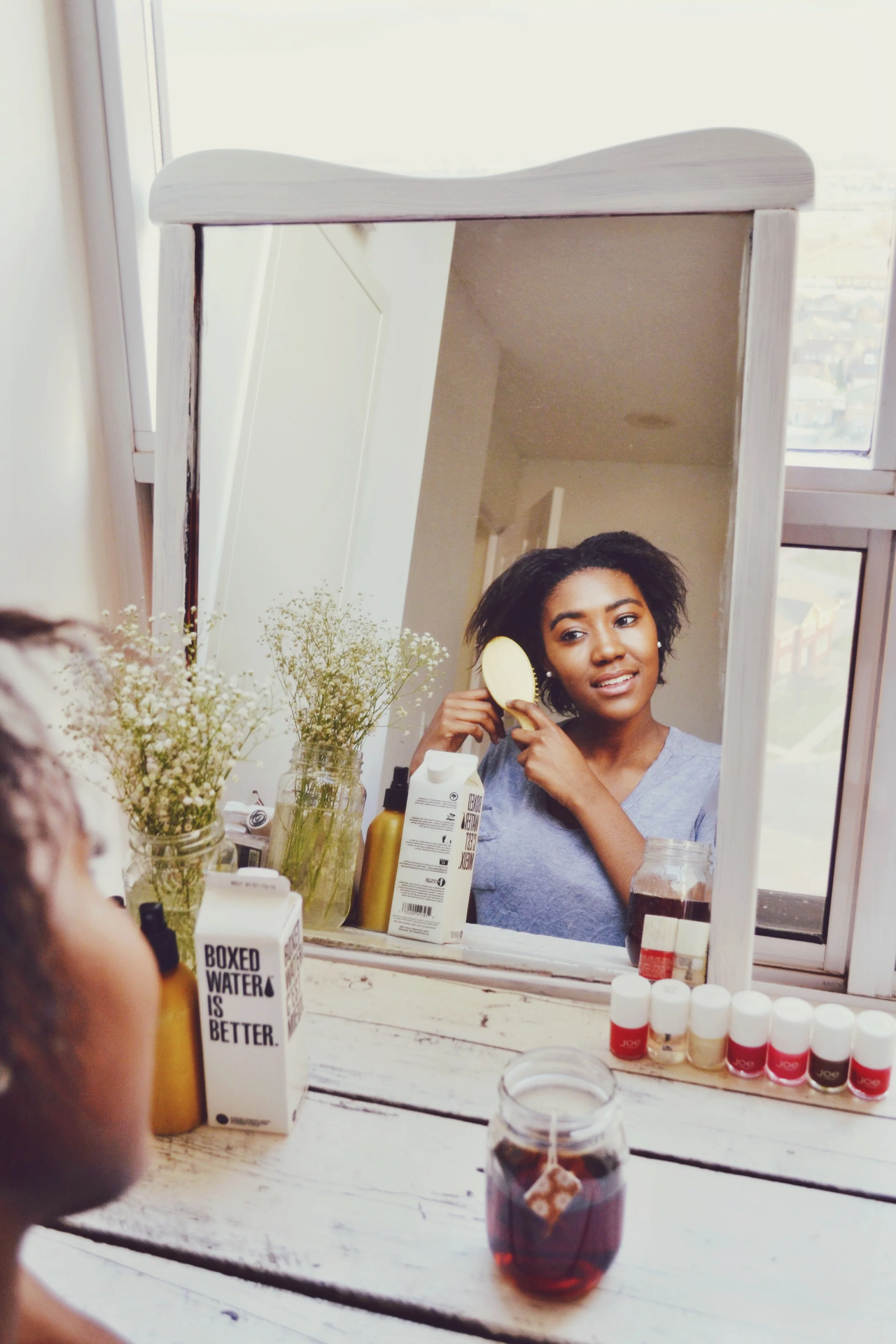 My vanity is by far one of my favourite corners. I do my makeup and sip my tea here every morning while the sun comes up. My table and and mirror are both vintage finds from back home up North. I love how it has a minimal country vibe.